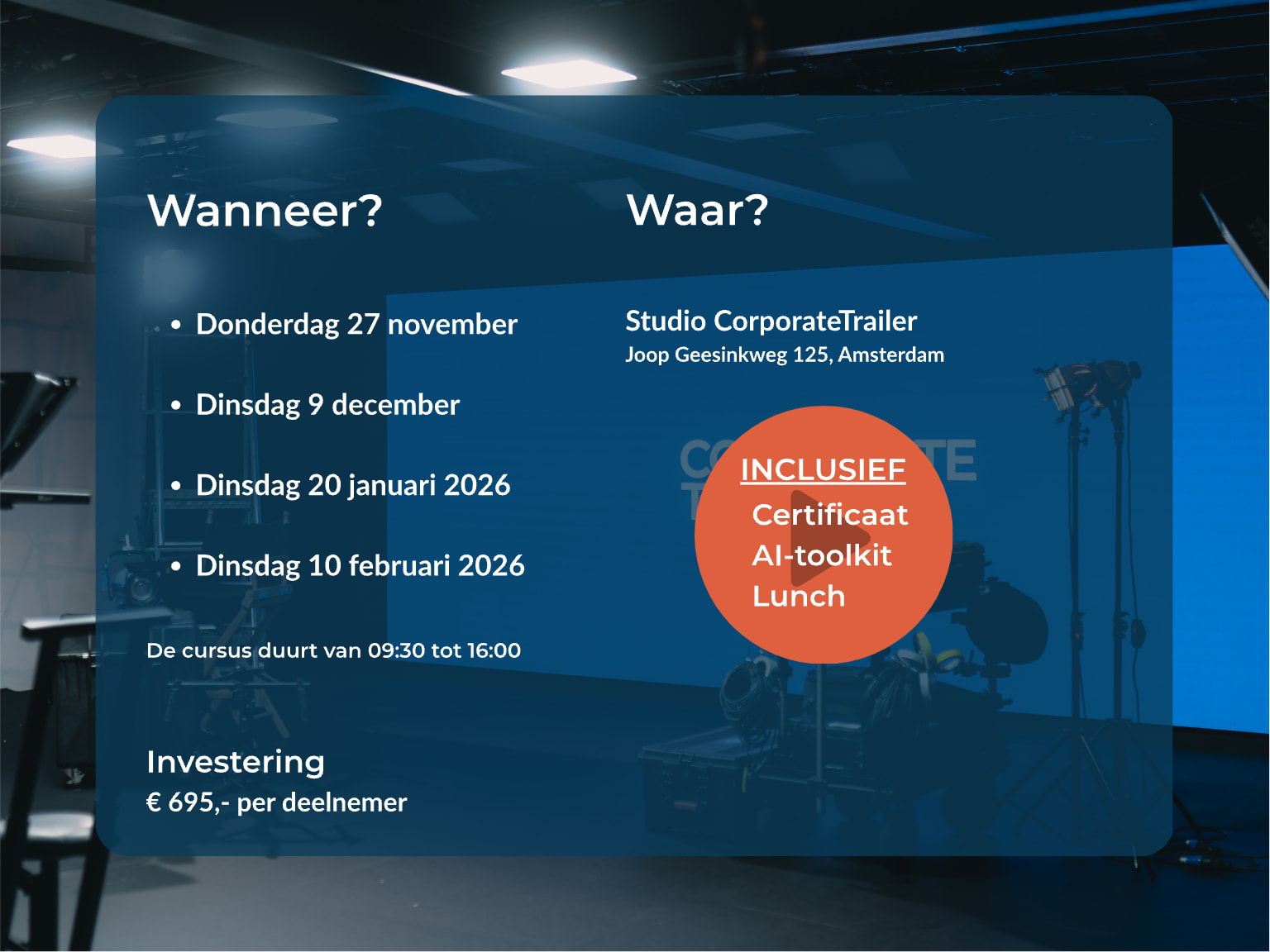 CorporateTrailer biedt een compacte, praktijkgerichte training waarmee je alle essentiële kennis én certificering behaalt om AI professioneel te kunnen inzetten.
